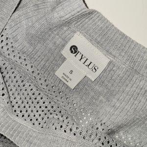 The body is made of 60% Cotton, 20% Modal, 20% Nylon, and the bottom of the sweater is made of 100% Polyester. In great condition.