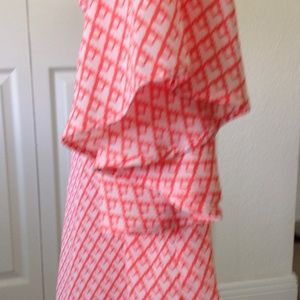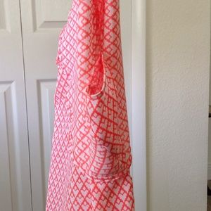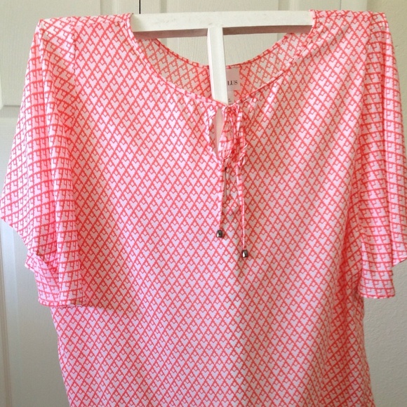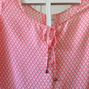 Ladies pullover top by Stylus. 100% Polyester. V-neck with tie. Dark pink and white design. Short sleeves with "cover over" sleeves for fullness. Small center yoke down back Very soft and comfy.Size is X-large. 28" long. Pit to pit 20".
