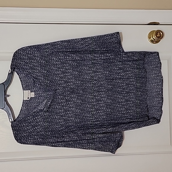 size large, blue and white blouse. the back near the neckline has a pleat. it's difficult to see in the picture.