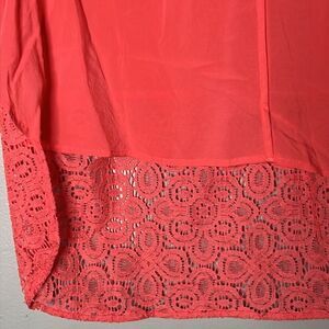 A really attractive coral Stylus lace trimmed high/low blouse with 3/4 length sleeves. Lace accents across shoulders and hemline. Very flattering high/low look. Size Large