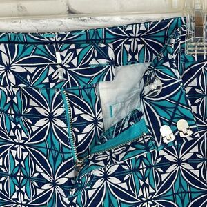 Two vertical front pockets and sewn back pockets - can be cut open if desired