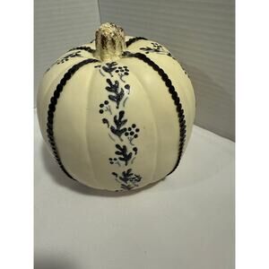 Its lightweight construction makes it easy to place on shelves, mantels, or tables. The neutral tones and navy accents complement a variety of decor styles, making it a versatile addition to your fall decorations. Get ready to welcome the season with this lovely pumpkin!