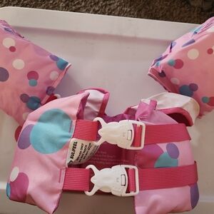 This adorable pink swim vest features playful polka dots, perfect for your child's water adventures. Designed for comfort and safety, it's a must-have accessory for fun in the pool.