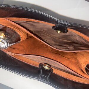 Stylish black tote bag with gold accents. Leather bag.