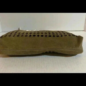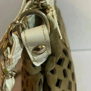 Suarez brown suede white patent leather shoulder handbag with silver tone hardware main compartment fabric & suede lining zip closure at top logo at front hight 9.5” width 12” depth 3” strap drop 12” The dimensions are based on approximately measurements before placing an order please check take a moment to view all photos using feature for a closer look