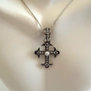 The Suarti Bali BA Cross Sterling Silver Natural Pearl Pendant Necklace is a stunning piece of fine jewelry crafted with a cross pendant design. The main stone, a beautiful cream-colored natural pearl, set in ornate beaded design Sterling Silver.