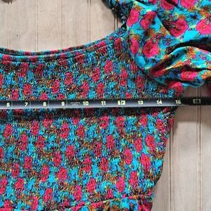 Such a beautiful rose print, teal, blue, pink Fushia, green color.