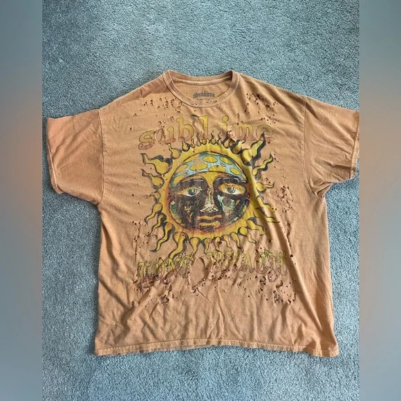 Sublime rocker tee, orange, destroyed “Vintage” look! Men’s size S/M, looks oversized