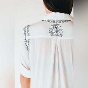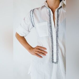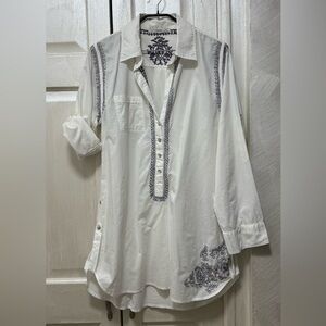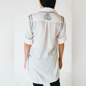 Subtle Luxury Women M/L White Cotton Blue Embroidered Boyfriend Shirt Tunic