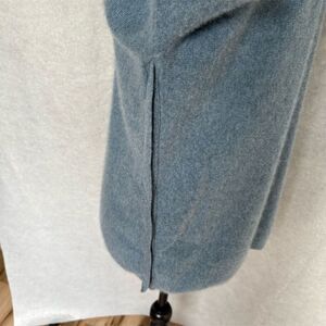 This Subtle Luxury women's pullover sweater is crafted from soft cashmere, featuring a V-neck and 3/4 sleeves. The solid blue design includes a side slit for added style. Made in China, this regular size S sweater is suitable for casual outings or relaxed gatherings. It requires hand washing for care. The item is pre-owned.