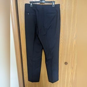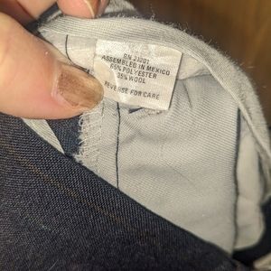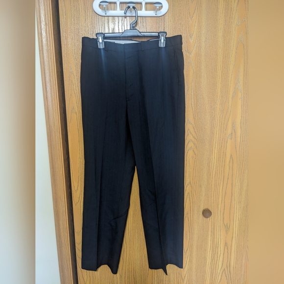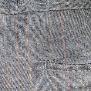 Wool blend navy blue dress pants with light red and mustard yellow pin stripes. Subtle pattern. Not certain of the size because there's no tag, but I think they're a 32" waist. Good quality. Vintage.