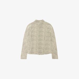 This is an elegant, lightweight, and slightly sheer long-sleeve shirt. It features a subtle, woven grey and cream speckled or dotted pattern and a classic collar with button-front closure. The minimalist design and light fabric make it perfect for layering or adding a sophisticated texture to any outfit.