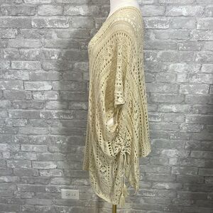 Stay stylish at the beach with this elegant beige crochet swim cover-up. Perfect for adding a touch of sophistication to your swimwear ensemble.