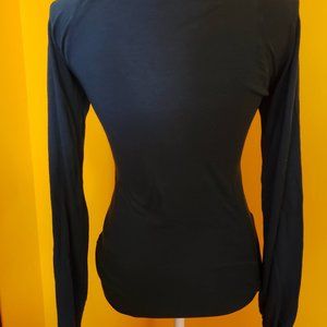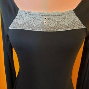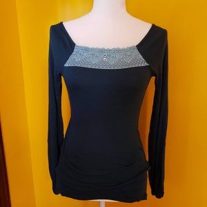 Deep Midnight Blue-Green Pullover Knit Square Neck Top with Blue Lace. This top accentuates a narrow waistline beautifully. I got to wear it when I was an extra on an independent film once. The scene was in a diner, and I was instructed to flirt with the stranger across the table from me. We giggled a lot b/c it was so weird. I rocked that top though, but it's time for someone else to chase stardom in it. Lightly worn, very good condition. Ultra flattering.