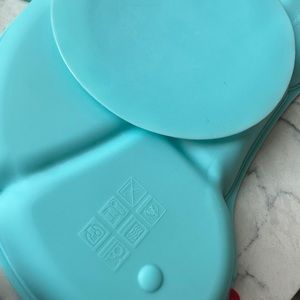 Navy blue bowl is such a great design. Deep enough so good doesn’t overflow, and is a great size for small hands. It’s Green Sprout brand. The chicken plate is awesome for even my 6 year old. It’s awesome for breakfast foods too or snacks for both kids. Both work well with glass tables, or high chairs. Both were very gently used (a few times).