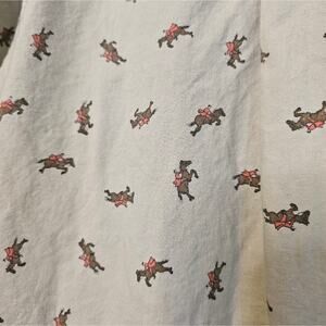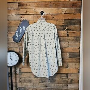 the main background color loke a brown/gray color with a green undertone. this top changes color in different lights so much with the background color thsy the color was hard to describe. has a red rider on a brown colored horse that look like they are jumping.. has a collared neckline. buttons start at the top of the neckline and go down almost to the hemline. there are large pockets on each side with flap and button closures. the sleeves are approximately to the wrist. the end of the sleeves are cuff meaning the sleeves button up at the wrist. the hemline in the front and back is rounded. the back is 4 inches longer than the front. the last picture shows a stain. u had to change the lighting to really get it to show but it isn't actually thay dark. there are spots like this in several places in the front. one on the right pocket. another down by the left side hemline. this is vintage so it is not going to be perfect. found no other issues or flaws. smoke-free home and pet friendly home.