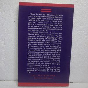 In Sudden Violence Master Jones outlines the no-nonsense self-defense principles of this little-known fighting art. This book is in good condition with some minor underlining and marks on he first few pages. These marks do not carry thru a great majority of the book. The book is almost in like new condition. It is copy right 1988. The book is illustrated and has written instruction.