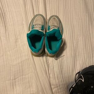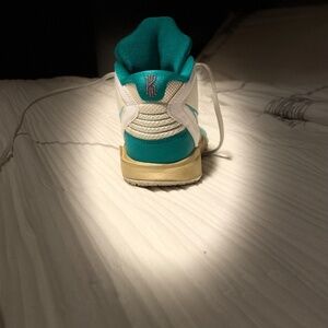 Almost new, gently used Sue Bird x Nike Kyrie Infinity GS ‘Golden Tribute’ pays homage to the WNBA star. Kyrie Irving’s eighth signature shoe features an ivory-hued textile upper with tonal leather paneling and soft turquoise accents throughout. ‘Keep Sue Fresh!’ is inscribed on the left tongue in purple embroidered lettering, while Kyrie’s signature is scrawled on the opposite tongue. A dull gold finish is applied to the Phylon midsole, supported by a data-driven rubber outsole.