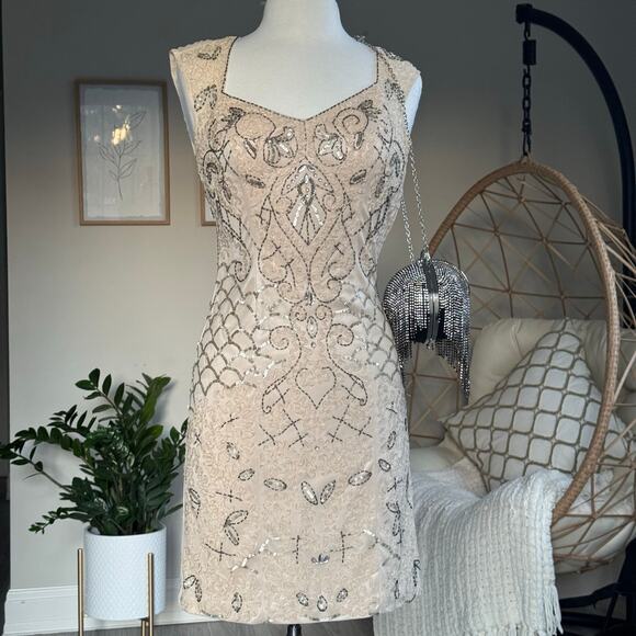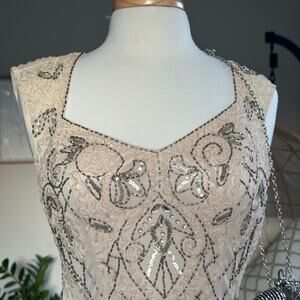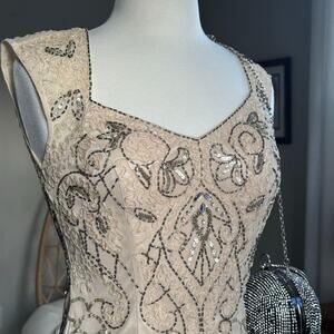 Sue Wong, cocktail dress, formal dress, beaded dress, embellished dress, wedding guest, evening dress, size 2, champagne dress, nude dress, art deco