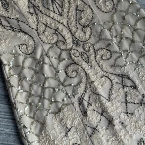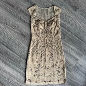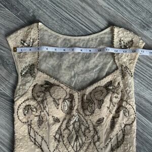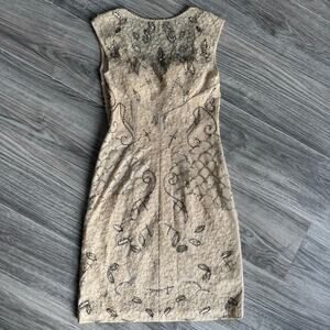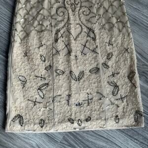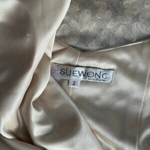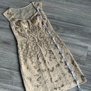 Stunning Sue Wong cocktail dress in a flattering size 2. Features intricate allover embroidery with bead and sequin detailing in a soft champagne/nude tone. Elegant fitted silhouette with illusion overlay and classic sleeveless cut. Perfect for weddings, cocktail parties, formal events, or evening occasions. Timeless, glamorous, and beautifully made.
