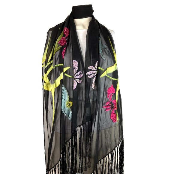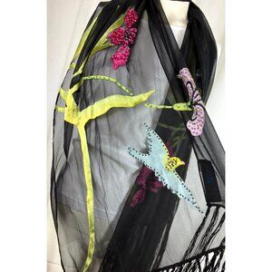 Sue Wong Noctourne Chiffon & Cut Silk Floral Bird Scarf Black