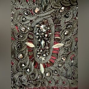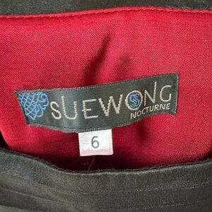 This exquisite dress by Sue Wong is perfect for a wedding guest or cocktail event, featuring a square neckline. The dress combines a sophisticated black and red color palette, adorned with sequins and beadwork for a glamorous touch. Its elegant style and intricate detailing make it a standout choice for any special occasion.