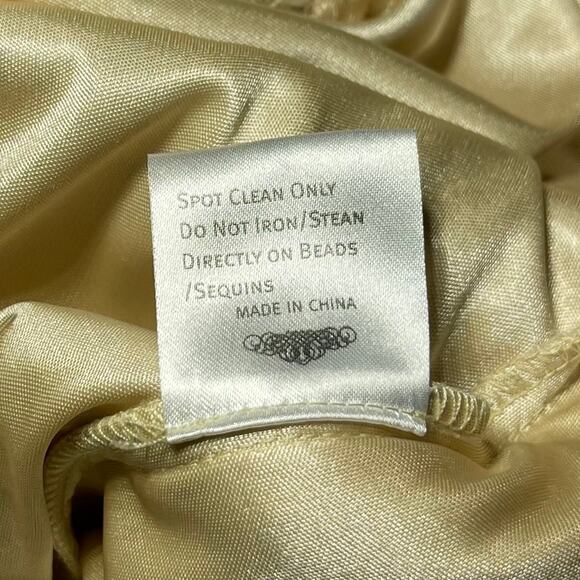 This Sue Wong Nocturne dress is an absolute dream! The cream color is so elegant, and the illusion soutache detailing adds a touch of magic. Perfect for a formal event or a special party. You'll feel like a princess! It has built in bust padding and is in excellent pre-owned condition. Measurements: Pit to pit: 15.5" Waist: 13" Hips: 15" Shoulder to hemline: 37.5"