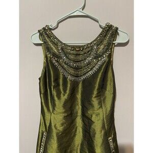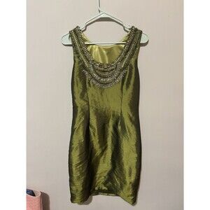 The Sue Wong Nocturne Green Beaded Jewels Womens Dress in size 6 is a stunning pencil dress perfect for special occasions like weddings or parties. The dress features a sleeveless design with a solid green color adorned with intricate beaded accents, adding a touch of elegance. Made with a luxurious lace fabric, this knee-length dress exudes a formal and sophisticated style that is sure to turn heads and make a statement. Perfect for a woman looking to make a bold fashion statement at her next event.