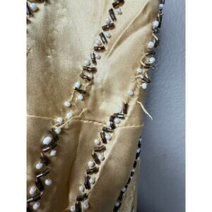 Stunning gold silk evening gown with floral tonal embroidery, shimmering beads and pearls, a sweeping fishtail hemline and halter neck. Gorgeous beaded tassels finish the back. This dress is in excellent condition with a couple of loose threads on side of bust, see photo. Padded bodice so no need for bra. Measures 13” armpit to armpit approx, 60” length.