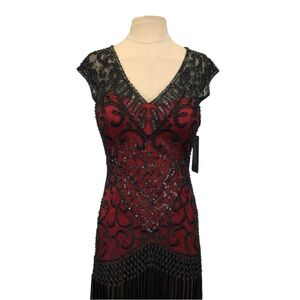 features: this dress is an absolute show stopper for any black tie event. Micro cap sleeve. V neckline. Embellished with beading and sequins. Baroque sheer lace overlay upper. Floor length skirt with black fringe over lay. Zip closure.
