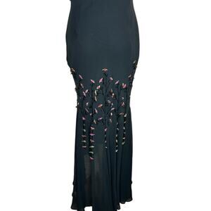 Silk chiffon floral beaded midi slip dress cocktail gown from Sue Wong, size 4. Black silk with pinkish sequin and beaded flowers. Empire waist. Cut-out at back. Handkerchief hem. Ideal for fairy goth, grunge, 90s, Y2k, and feminine vibes.