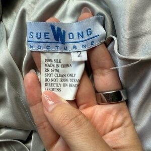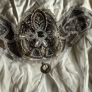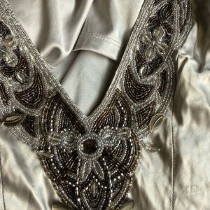 Chic gray dress with silver embellishments. Flowy design. Ideal for weddings. Heavy with lots of beading and a built in bra