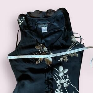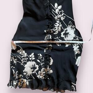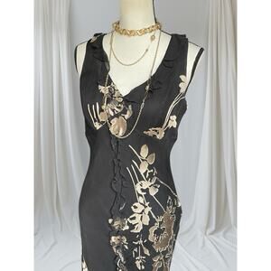 This Sue Wong Women's Silk Maxi Slip Dress in Black and Beige is a glamorous vintage piece from the 90s Y2K era. The dress is a silk chiffon featuring a burned out beige satin floral pattern, a ruffled V-neckline, sleeveless design. It has a side zip closure and is very stretchy so comfortable and dressy for your formal events, weddings, parties, or even a date night out.