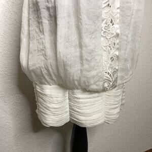 Sue Wong white lace applique bubble skirt sleeveless dress. V sweetheart neckline. Lace applique shoulder straps and back panel. Balloon skirt with pleated hemline. Zips on side. Fully lined. Slightly padded bust. Size 4. Very good preowned condition. A few tiny snags on bust and light spot on back neckline.