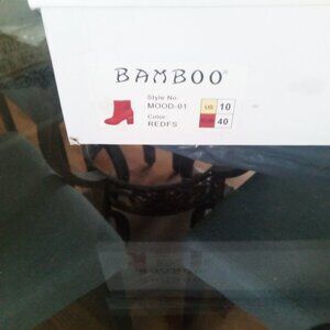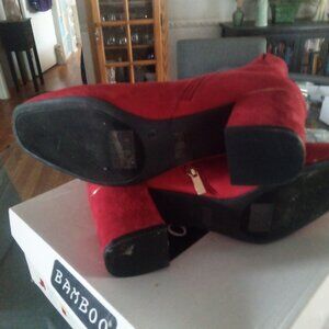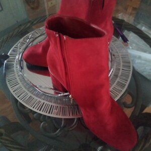 Red suede Ankle boot with side zipper. 3 inch heel with gold tone accent. Worn only two or three times. Excellent loved condition.
