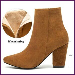 Suede Ankle Boots Chunky Heel Pointed Toe Side Zipper Dressy Booties