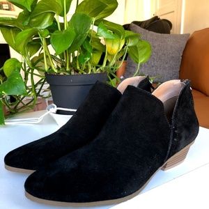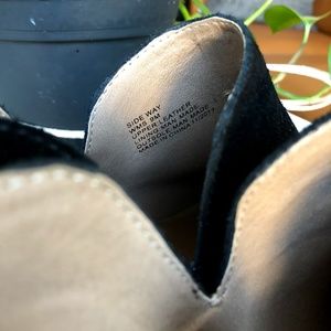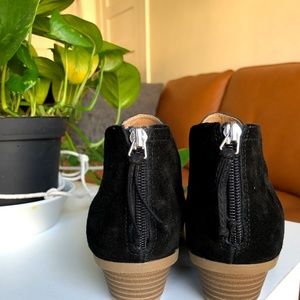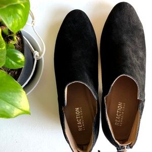 Chic black suede leather booties by Kenneth Cole--they go with everything! I only wore them once for about 3 hours. They're comfortable and so cute. One super minor stain on top of one shoe (the pics highlight it, but really unnoticeable in person), which can be cleaned with suede cleaner.