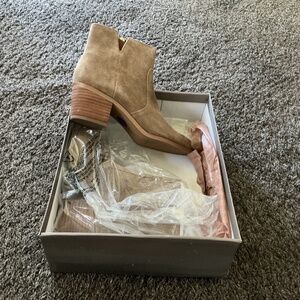 Tan suede ankle boot but Franco Sarto. Leather upper with inside zipper.