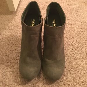 Only worn once!! Light olive with a grey undertone. About 2 1/2-3 inch heeled booties. Gold zipper detailing; suede material.