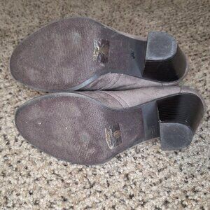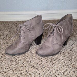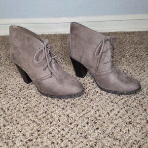 3" heel booties in a light brown suede. Tie up front. Size 8M