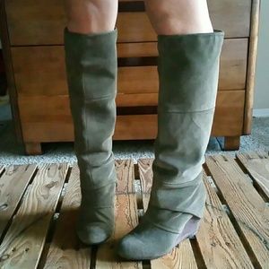 Olive green suede wedge boots. Tiered with zippers at top and bottom in back. Leg or the top section layers over base of boot. Interesting. Great shape