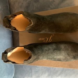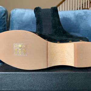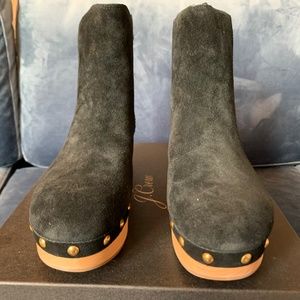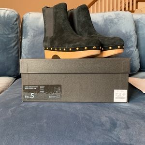 Size 5 black suede Chelsea clog boots from J Crew. Boots are calf suede with gold studs surrounding and lined faux fur. Soles are rubber with 50mm heel. Brand new and in original box.