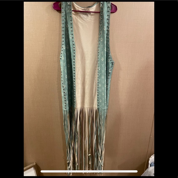 Suede duster with studded fringe attached. Western print on the mint green material. Floor length