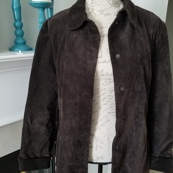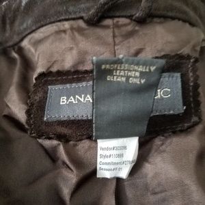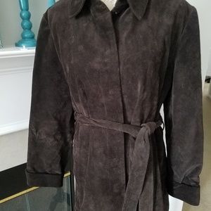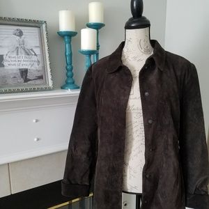 Banana Republic suede snap front jacket with belt. EUC jacket measures 31" in length from shoulder and 16" from shoulder to shoulder.