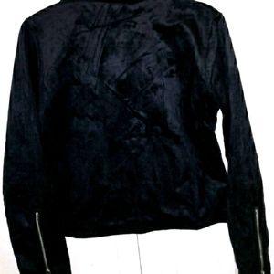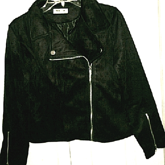 Black suede zip up jacket with silver buttons and zippers at the wrist... this jacket is brand new and is fitted runs really small it comes in two sizes Large and 2XL...