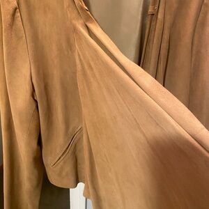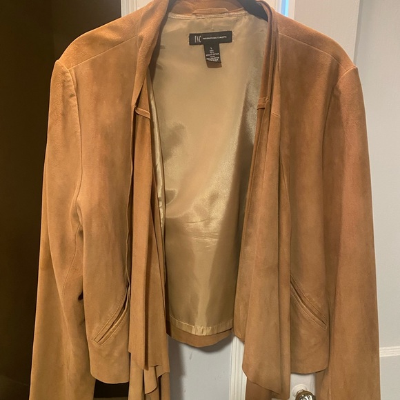 INC International Concepts - suede jacket , no buttons or zippers . Blazer concept 2 side pockets , lightweight perfect for fall , has draping in front - Camel color - size Large