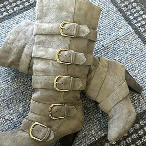 For sale is this pair of very cute suede knee high boots. The are in excellent condition with no tears or water stains. Each boot is accented with 5 beautiful buckles. Unfortunately the size is not marked on these boots, but I believe they are a women's 5 1/2 or 6. They were my daughter's and they were way too small for her size 7 foot. There is slight wear on the soles and heels but still in great condition. Heels are 3" high.