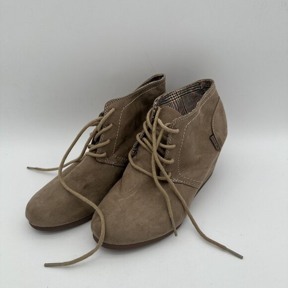 Versatile taupe wedge boots designed for comfort and style, featuring soft suede-like material and a subtle plaid interior accent. Ideal for transitional wardrobes seeking elevated casual footwear.