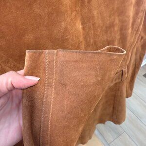 Gorgeous brown 100% leather suede coat with plush faux fur collar and matching tie belt. Features button closure, fully lined interior, and a flattering tailored fit. Timeless vintage-inspired style—perfect for fall and winter layering.