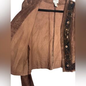 Suede Leather Jacket Beaded Womens Brown Open Front Sequins Chico's Size 0 (S)